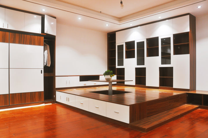 (1)次臥可以做榻榻米,現(xiàn)在的榻榻米基本都是定制,可以卡墻做,不浪費空間,榻榻米高度一般在400mm-450mm,內部箱體可以用來存放過季的被子,衣物等。且榻榻米上面還可以做衣柜書柜等,空間利用率非常高。