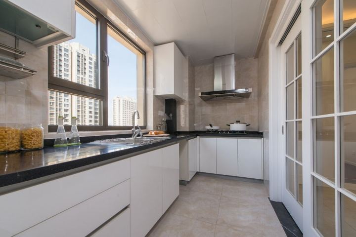 開放式廚房固然美觀,但油煙、收納及整潔性等問題是不得不面對的,不妨考慮安裝玻璃推拉門,透過玻璃看到家人和自己在一起,做飯也就沒那么無聊了,推拉門相對于平開門而言還可以減少開關門占用的空間。