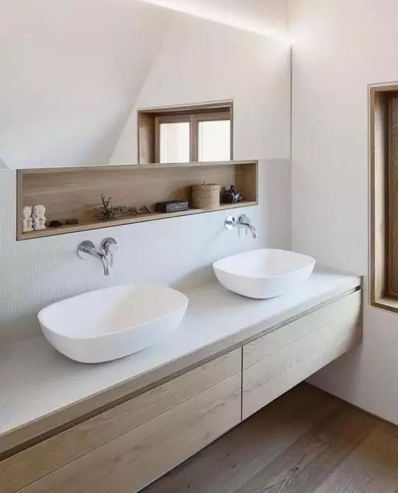 衛(wèi)生間的收納形式多種多樣,壁龕、擱板架、鏡柜、浴室柜等,都能將化妝品和洗漱用品通通歸置起來(lái),既提高了空間利用率,又能方便日常拿取,功能上一舉兩得。