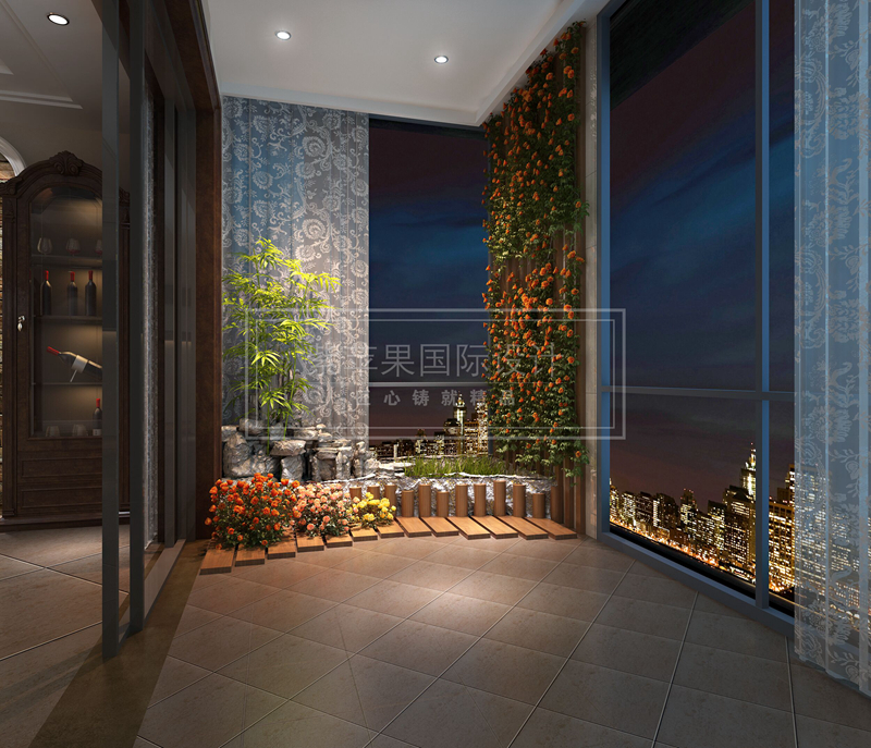 如果是陽臺面積較大又位于頂樓,可在陽臺上搭建個(gè)陽光房,把陽臺當(dāng)作房間使用。陽光通過采光板照射及在房間的墻壁上,以及青石板鋪成的地面,而且也照亮了人字型的鵝卵石小徑。這些園林造景手法,用在陽臺上,會給人濃濃的休閑感。