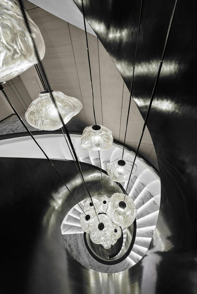 樓梯使用黑白色經(jīng)典搭配,簡(jiǎn)約沉穩(wěn),個(gè)性裝飾吊燈,仿佛一幅立體畫般,與整體融合成為立體的藝術(shù)品。