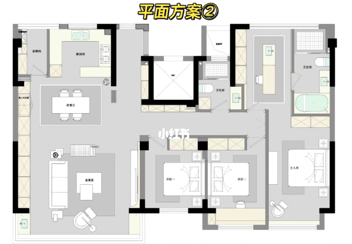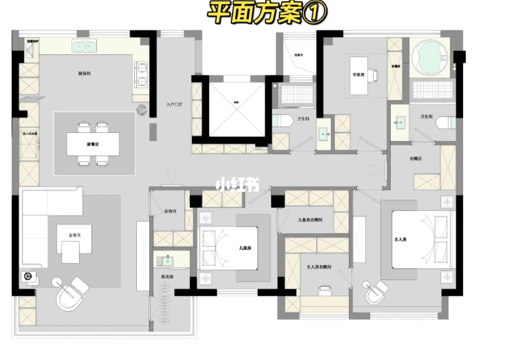 首先做了一個(gè)敞開(kāi)式的大廚房,此方案兩個(gè)臥室,起居室都在南面,一個(gè)大的套房作為主人的休息區(qū),另一個(gè)兒童房,適合小年輕居住,北面的空間主要是小書(shū)房和洗浴區(qū)域。