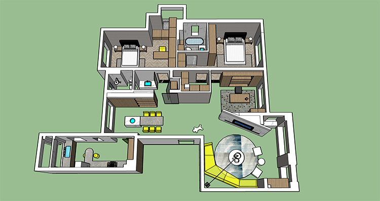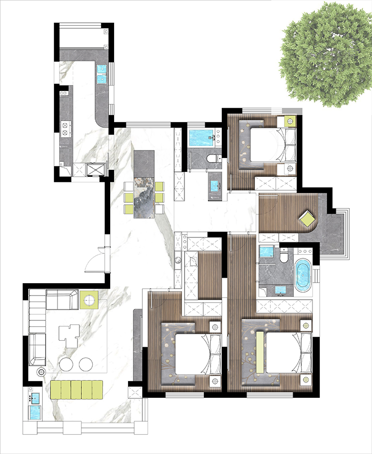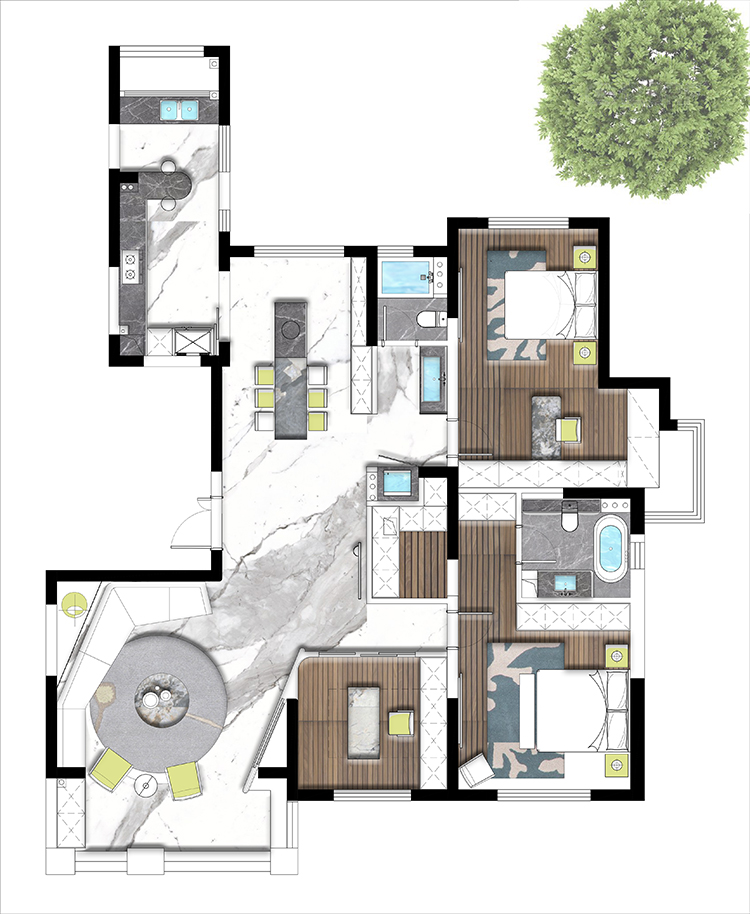方案一比較常規(guī),進(jìn)門開放處理,做了一個(gè)玄關(guān),兩個(gè)房間朝南,餐廳旁邊做了一個(gè)玻璃移門,平時(shí)可以關(guān)起來(lái)!方案二也是設(shè)計(jì)師主推的一套方案,進(jìn)門一個(gè)玄關(guān),整體空間往南面移了一點(diǎn),由于承重結(jié)構(gòu)進(jìn)入客廳的過(guò)道永遠(yuǎn)打不開,是大平層的空間感提現(xiàn)不出來(lái),所以我們?cè)O(shè)計(jì)師如圖拉了一個(gè)平行的造型,追大程度打開這塊空間,然后其他兩塊區(qū)域也劃分明了,大人小孩互不干擾,書房也設(shè)置在南面,整體視野非常開闊,可以看到蠡湖風(fēng)景。客戶也很此套方案。方案三也比較常規(guī)