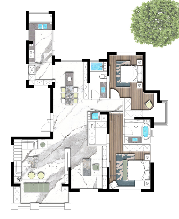 原始結(jié)構(gòu)進(jìn)門有一個(gè)衛(wèi)生間,不太合理,設(shè)計(jì)師后期全部打開來(lái)做,由于承重結(jié)構(gòu)三個(gè)房間的位置也比較固定,所以我們把主要的改動(dòng)思路放在了公共區(qū)域即客餐廳這幾塊空間。