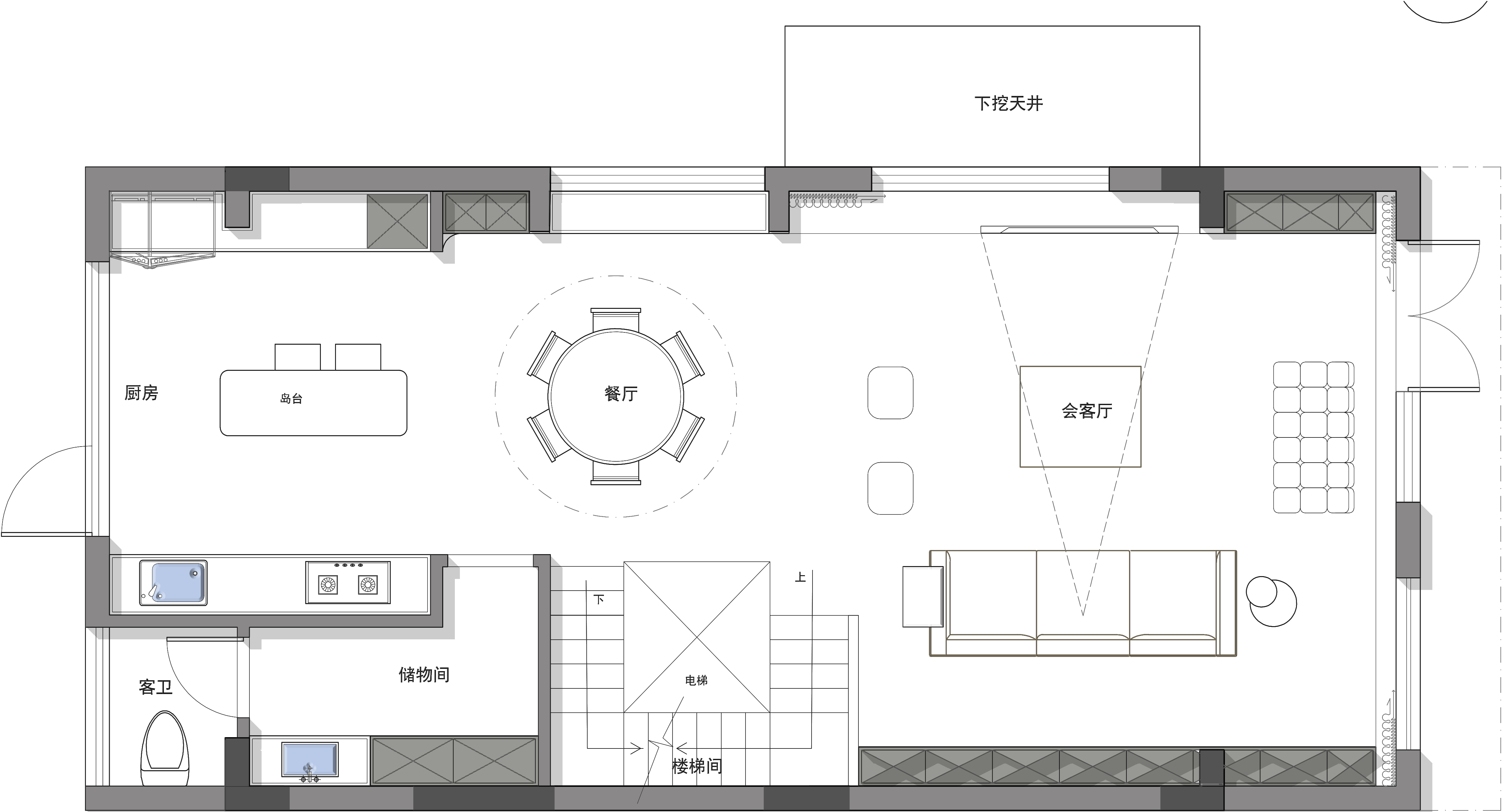 地下室也是基礎(chǔ)的休閑待客區(qū),一樓的廚房比較有特色,進(jìn)門之后穿過客廳,就是開放式廚房加長(zhǎng)有一個(gè)長(zhǎng)島臺(tái),客餐廳連在一起一樓很通透開闊!廚房那邊開了一個(gè)后門方便去后院!