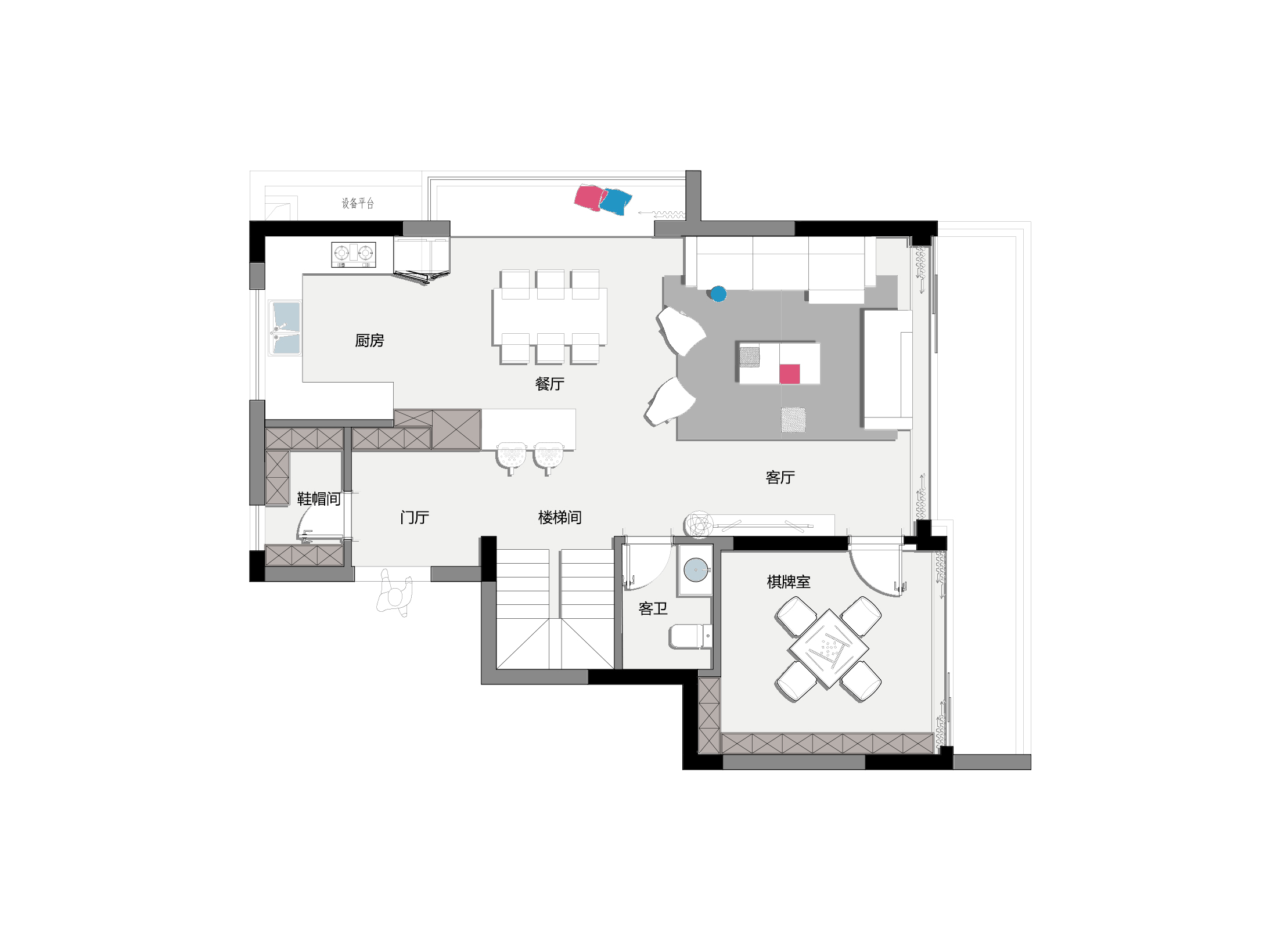 一層方案,一稿是做了一個半開放式廚房,北面做了一個次臥可以方便老人居住,沒做老人房的一稿方案把陽臺打通,是一個開放式廚房,餐廳連在一起的長島臺,南面是一個棋牌室或多功能區(qū),品質(zhì)很高。層是主要的休息區(qū),方案一做了兩個起居室,一個大套房,另一個方案則做了一個書房,一個大套房,一個次臥。