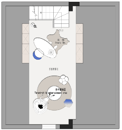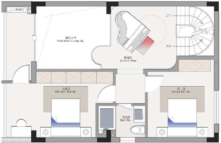二樓設(shè)置了兩個(gè)房間,其中一個(gè)兒童房,在樓梯口上來(lái)的公共區(qū)域放置了小孩的三角鋼琴,上樓儀式感十足,旁邊一個(gè)挑空區(qū)域很浪漫優(yōu)雅,專為女主人打造。