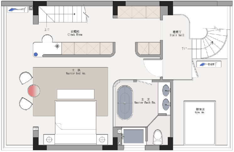 三樓整體做的一個(gè)主臥大套房,外面公共區(qū)是一個(gè)男主人的健身區(qū)域,后面的樓梯上去閣樓設(shè)置了一個(gè)親子娛樂(lè)區(qū),整體品質(zhì)非常高!