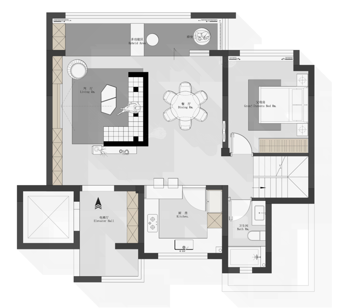此戶型原始結(jié)構(gòu)比較方正,這個(gè)客戶的一樓沒(méi)有大動(dòng),保留了原始,陽(yáng)臺(tái)打通做了休閑晾曬區(qū)域,u型中廚設(shè)計(jì),空間足夠大,可以進(jìn)行美食烹飪,老人房也設(shè)計(jì)在了一樓