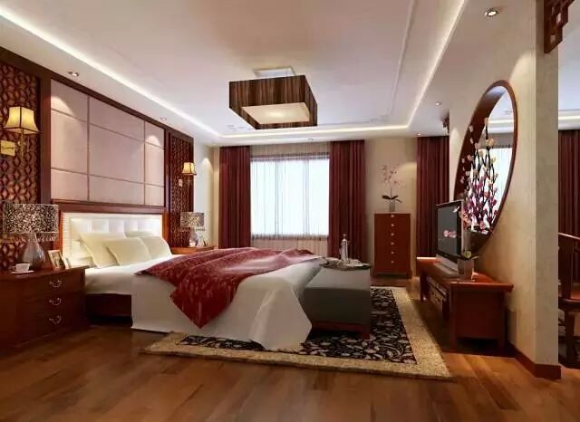 中國(guó)人最講究中庸之道,所以不論是家具陳設(shè)、間架配置,還是配飾陳列等等,都特別注意格局的齊整,力求達(dá)到端莊穩(wěn)重的效果,例如方正的床頭、左右對(duì)稱的床頭柜、亦或是屋頂?shù)牡鯚簟瓱o(wú)不造型簡(jiǎn)約大氣,沉穩(wěn)有加。同時(shí)在配色上,利用中國(guó)傳統(tǒng)的黑、紅、金為基本色,通過(guò)家具和飾品來(lái)構(gòu)成“紅色”主題,把中式風(fēng)格體現(xiàn)得淋漓盡致,讓整個(gè)室內(nèi)環(huán)境彰顯出簡(jiǎn)樸、對(duì)稱、高雅的格調(diào)。