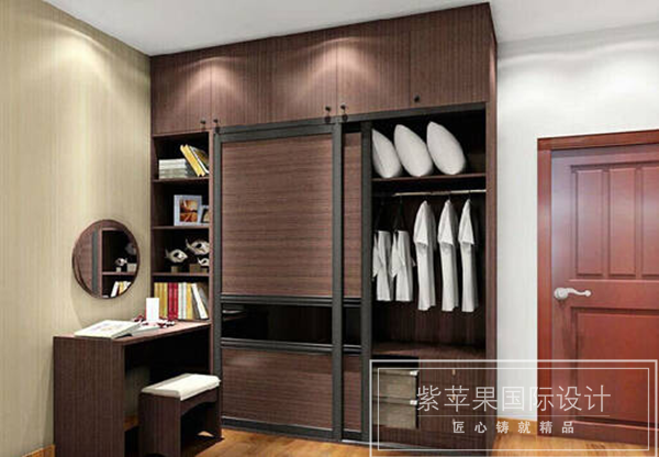 解決方法:布置衣柜區(qū)域有柱子,可以在此處做成淺柜的形式,解決掉柱子的問(wèn)題。淺柜與梳妝臺(tái)的拼搭,讓梳妝臺(tái)與衣柜整體統(tǒng)一,更具連貫性。