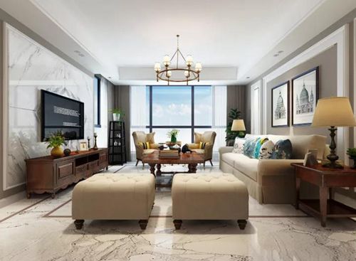 客廳電視背景墻采用白色護(hù)墻,搭配美式裝飾畫,選用美式家具,將空間層次搭配的條理有序,顯得大方得體