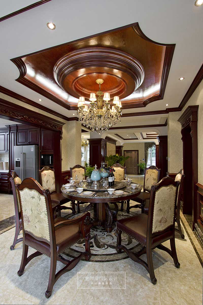 餐廳吊頂?shù)脑煨蛯哟胃袠O強(qiáng),四邊的吊頂不會讓圓形吊頂太過于突兀。圓形元素從頂部,餐桌貫穿到地面拼花。