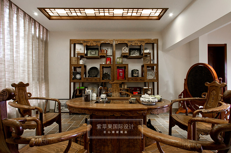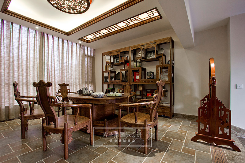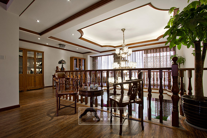 設計師除了以精致厚重的家具陳設凸顯空間的厚重與大家之范,更重視打造深遠的文化意蘊,配飾運用字畫、古玩、精致的工藝品加以點綴,彰顯主人的品位與尊貴。無處不在的文化韻味和獨特風格,體現(xiàn)中國傳統(tǒng)家居文化的獨特魅力。