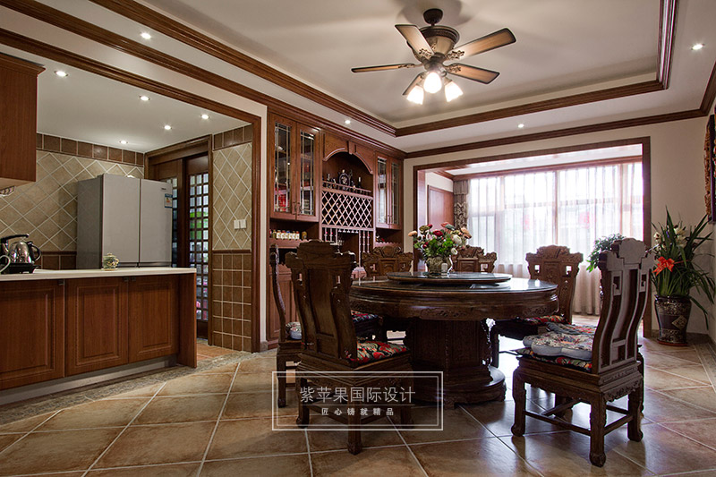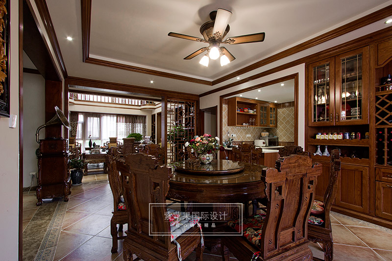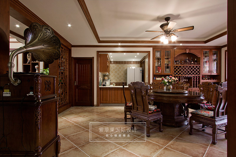 就餐時,角落里的古典留聲機,將那悠揚的曲子從遙遠的時代傳遞到現(xiàn)代,讓人變得仿佛穿越般的恍惚。中式家具作為古典元素在空間里的運用,將中式情懷納入空間之內(nèi),而空間里并非只是簡單的古典元素攫取,設計師將主人的個性與反應,以及居住舒適性的現(xiàn)代需求融入在居室里,讓空間形成獨一無二的符號。