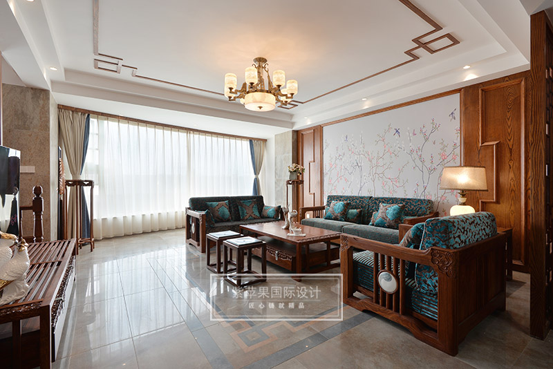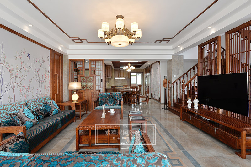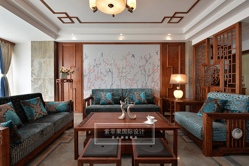 客廳的回紋吊頂和中式吊燈,搭配傳統(tǒng)韻味中式家具,形成了一個古雅清新極富傳統(tǒng)魅力的客廳空間??蛷d家具實木色澤,細(xì)致做工,花紋精美,散發(fā)著古色古香的韻味,與背景墻上灰色花鳥主題的花紋相互映襯,感受清雅精致,溫馨愜意。