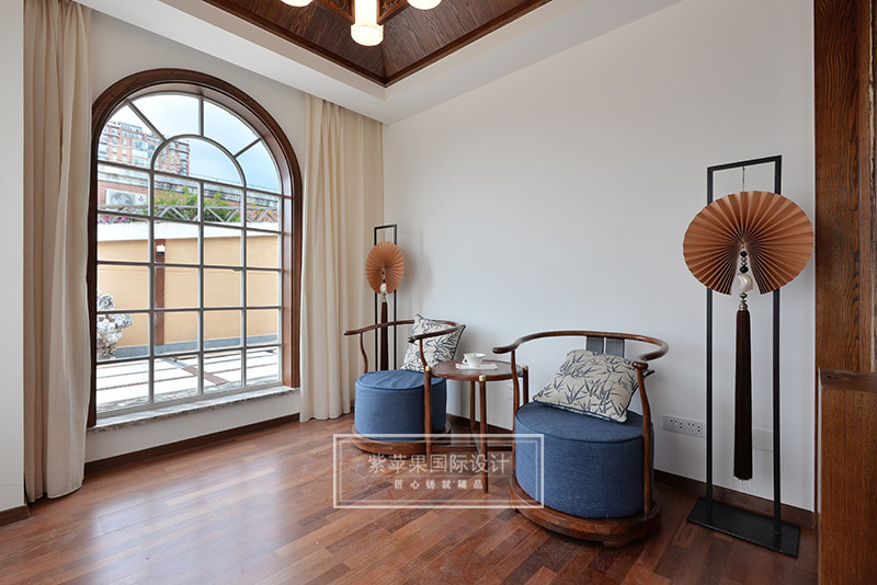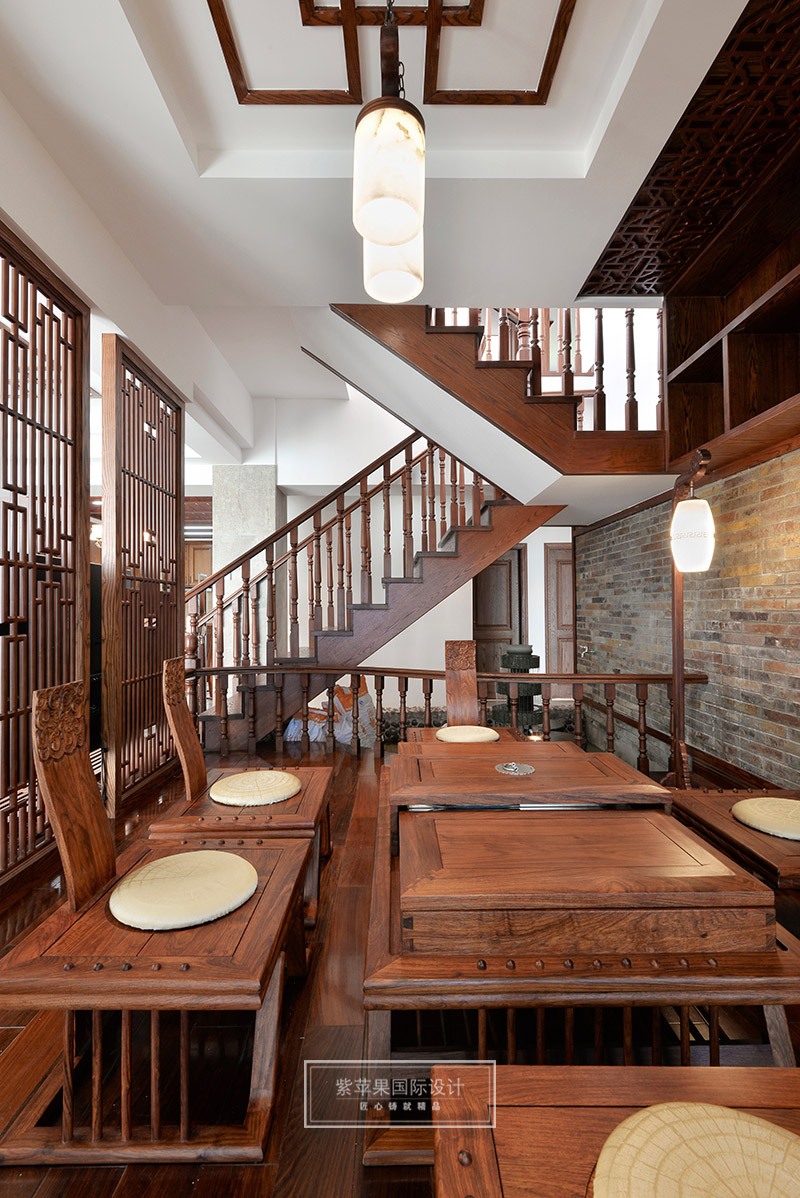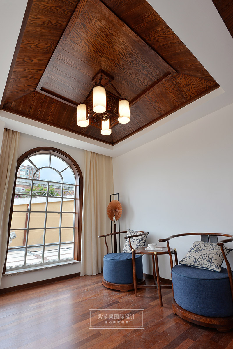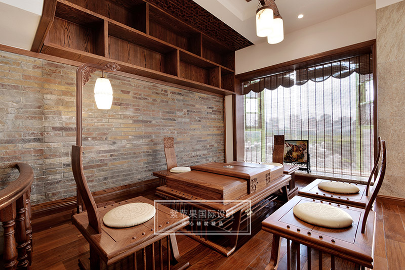 茶室與客廳也是運用木格花進行簡單隔斷,運用地面材料的變化進行空間劃分。茶室空間延續(xù)客廳實木色調(diào),因為品茶本身的器具會非常多,茶室的裝飾方面則變得簡潔起來,選用的家具都是線條比較流暢、造型簡單的中式家具,雖簡單卻不失韻味。茶室旁邊還有個室內(nèi)假山的景致,與家人或是親朋品茗聊天之時,又可聽到潺潺水聲,更有一番世外桃源的感受。茶室墻面保留了原有的銹石磚紋路,保留了老房子氣息,復(fù)古又有韻味。特別放置的吊燈和宮燈,也作為點睛之筆,為整體空間增添古色古香的傳統(tǒng)氣氛。