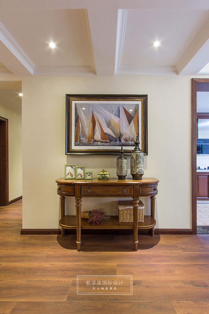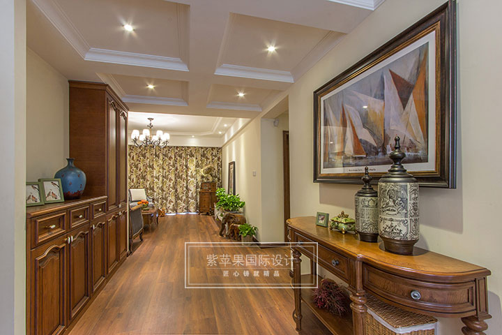 開門第一道美景,風(fēng)景油畫的淡雅與清新點綴在古典氣息的家具當中,搭配自然氣息濃厚的裝飾品,于古典中帶有一點隨意,摒棄了過多的繁瑣與奢華。營造出閑散與自在,溫情與柔軟的氛圍,給業(yè)主一個真正溫暖的家。