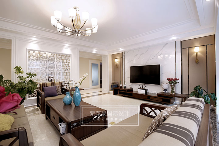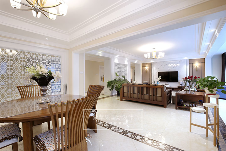 設(shè)計(jì)師將客廳、餐廳空間打通,讓室內(nèi)空間開敞、內(nèi)外通透,墻體采用鏤空設(shè)計(jì),讓自然光結(jié)合燈光,空間更加透亮,明亮的落地窗讓房子沐浴在陽(yáng)光中,當(dāng)正午的陽(yáng)光透過窗戶灑在室內(nèi),照暖沙發(fā)、茶幾、地板……此時(shí),一家人的休閑時(shí)光更加溫馨舒適!