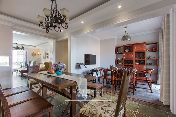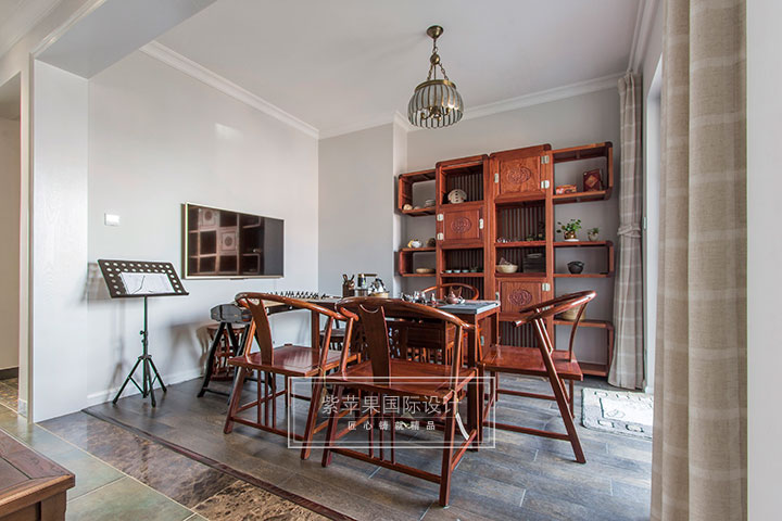 本案業(yè)主一家都很喜歡喝茶,所以廚房邊上的空間經(jīng)過改造與廚房連接成了一個(gè)古色古香的茶室兼琴室空間。在一個(gè)有著春日暖陽的午后,主人一家人在這里一邊聽著古箏,一邊悠閑地品茗,愜意的生活從點(diǎn)滴便可體現(xiàn)?;蚴侵魅艘粫r(shí)興起,為家人彈奏古箏,餐廳空間也會(huì)成為觀眾們安靜欣賞的區(qū)域,為家庭生活帶來更多情調(diào)。