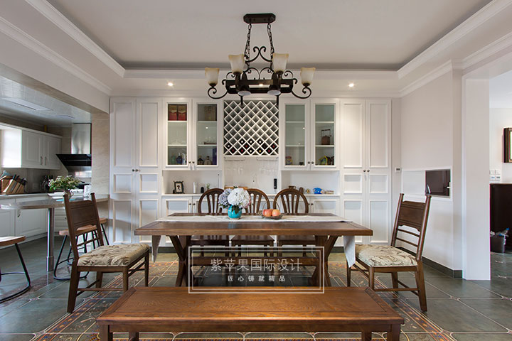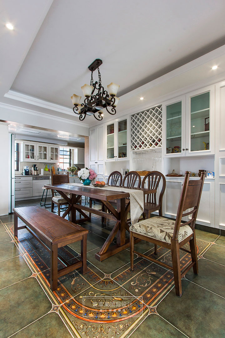 延續(xù)客廳墨綠色復(fù)古地磚,餐廳擁有同樣精美的景致。一整面酒柜的設(shè)計(jì)讓主人心愛的紅酒有了好歸宿,這樣的設(shè)計(jì)不但美觀,還增強(qiáng)了餐廳的儲(chǔ)藏功能,使得生活更加井井有條。