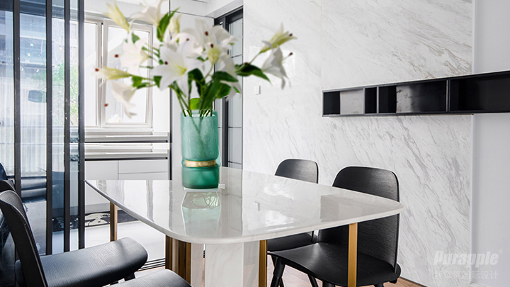 白色簡(jiǎn)易餐桌搭配黑色座椅,給人一種簡(jiǎn)約明亮的感覺(jué),餐桌上的小花也使得餐廳多了一點(diǎn)生機(jī).