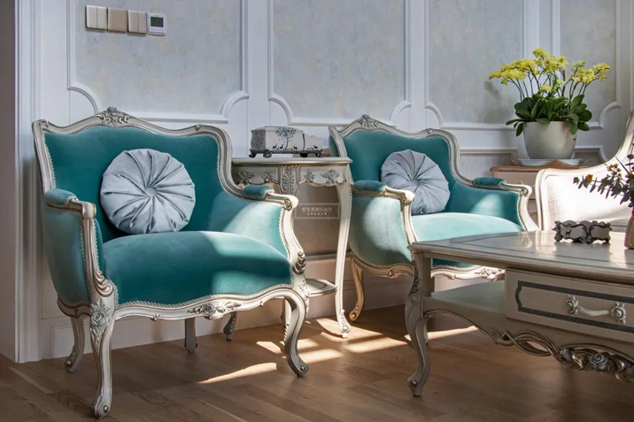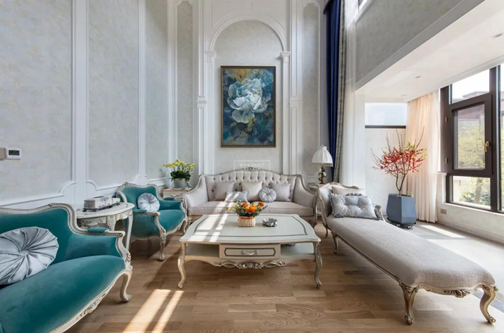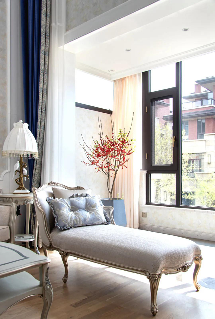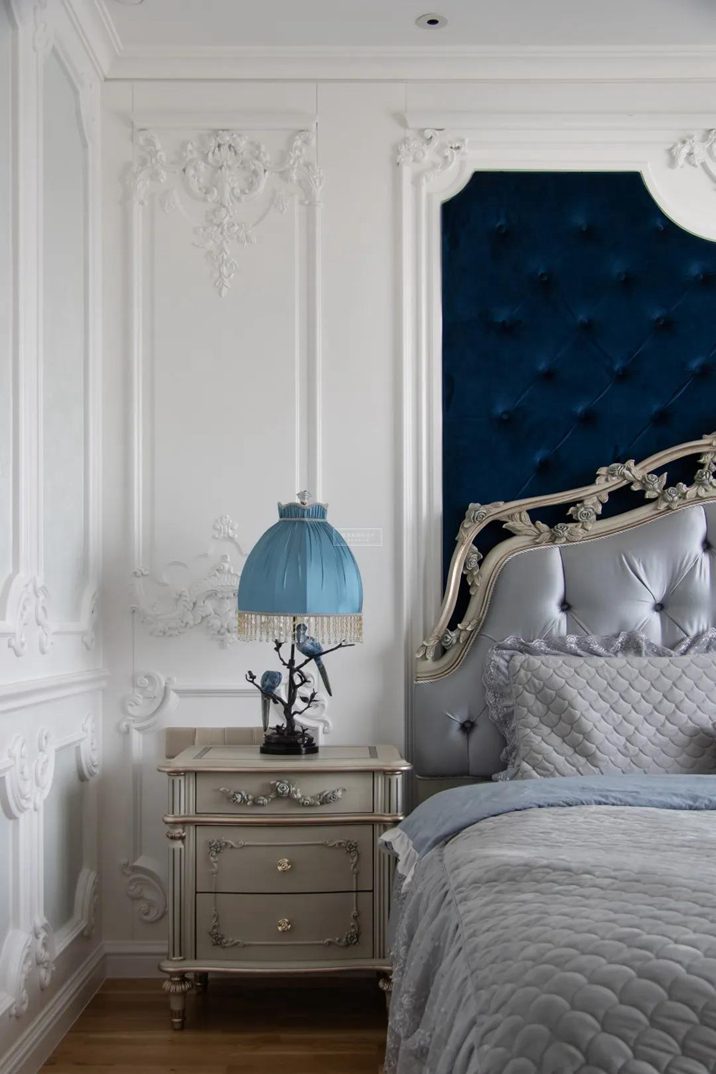 天花板、墻壁石膏雕花線條配合著絨布軟包的背景墻,獨占這一室的雅致輕盈。