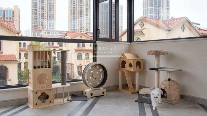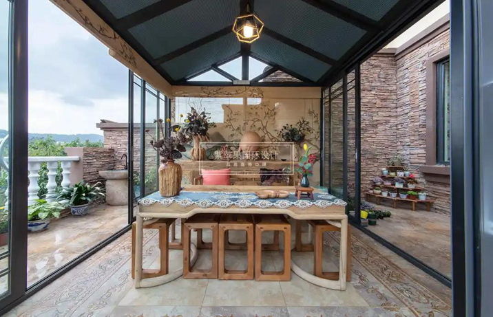 大露臺為南向,解決南向陽光房的隔熱是陽光房設計的難點,在此陽光房的設計為中空鋼化+內置鋁百葉頂面處理,及四向通風處理,配合繪畫竹簾來完成。
