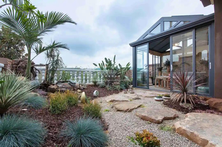 南向的花園采用旱式景觀,綠植選擇上也選配了小檳榔、甘青針茅、大鶴望蘭、膨珊瑚、七彩鐵、佛珠等抗旱的植物。