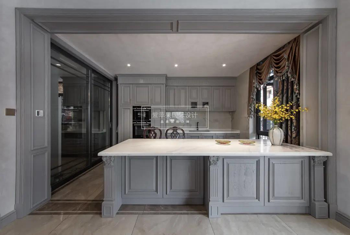 中餐重煙重油,單獨封閉設計,外面裝上玻璃門,隔絕油煙;西廚開放式設計,二字型布局,島臺裝在西廚與餐廳之間用作隔斷,營造出更具情調的生活氛圍。