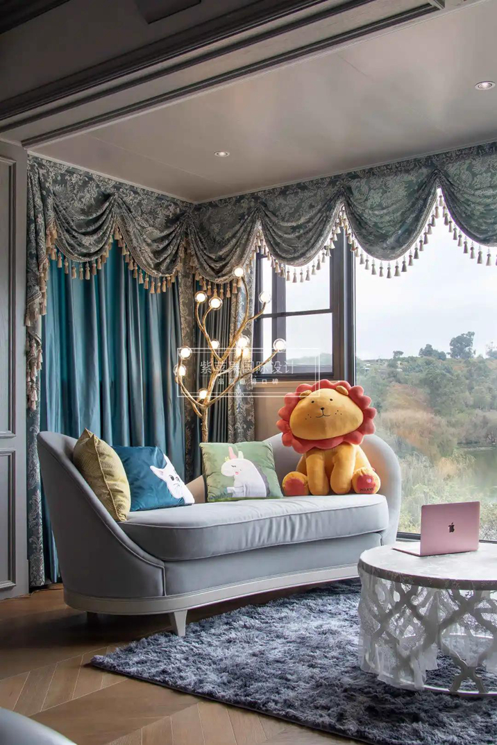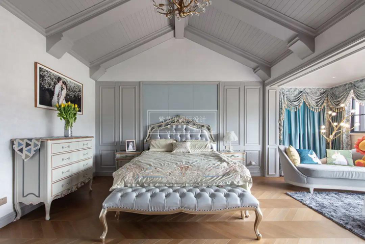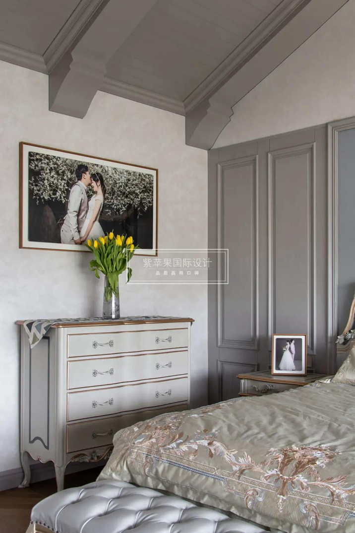 推開臥室的門,我想到了《致愛麗絲》這首鋼琴曲,仿佛看到了女主人溫柔、優(yōu)雅的形象?!拜p裝修,重裝飾”,不做復雜的硬裝設計,清新美式,淺淡的灰色,融入藍色的硬包背景墻色調,搭配立體雕花、銅色鑲邊的歐式家具,細膩且精致。