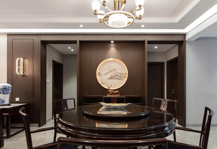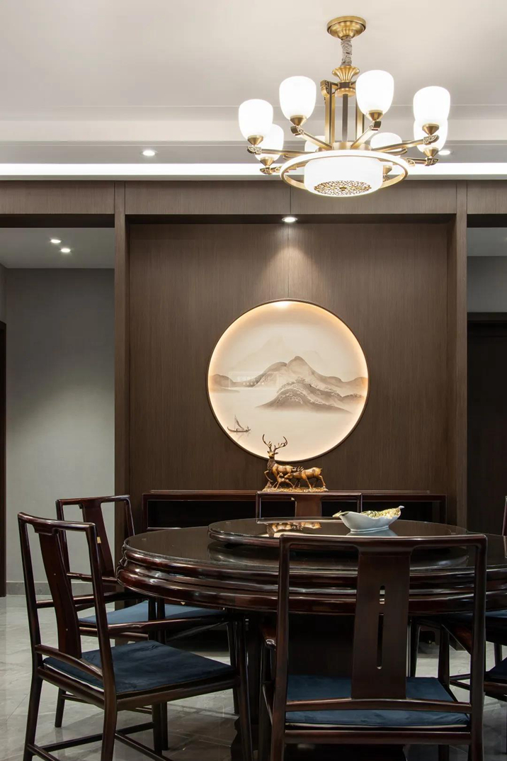 在傳統(tǒng)文化中美食一定是占比最多的一個,用餐要有儀式感,圓桌匯聚人氣更匯聚情感交融,配合從客廳延續(xù)過來的線條張弛有度形成空間獨(dú)特的韻律協(xié)調(diào)。