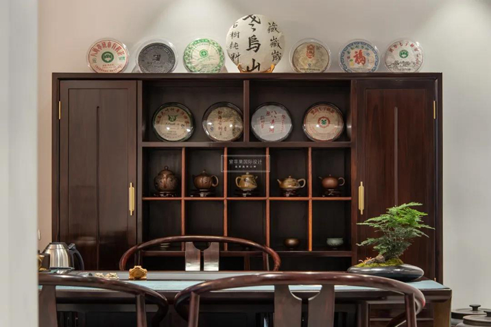 書房區(qū)域除了閱讀和學(xué)習(xí)還設(shè)置一個品茶區(qū),讓理性巧思碰撞心神放松,留茶香伴隨思想遠(yuǎn)航。